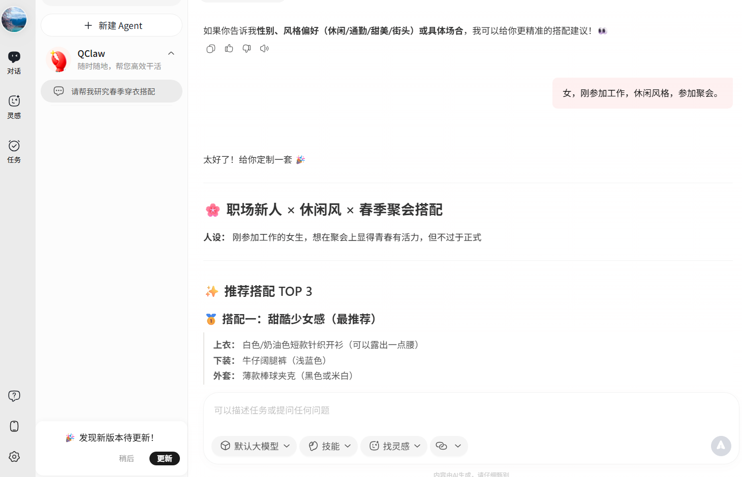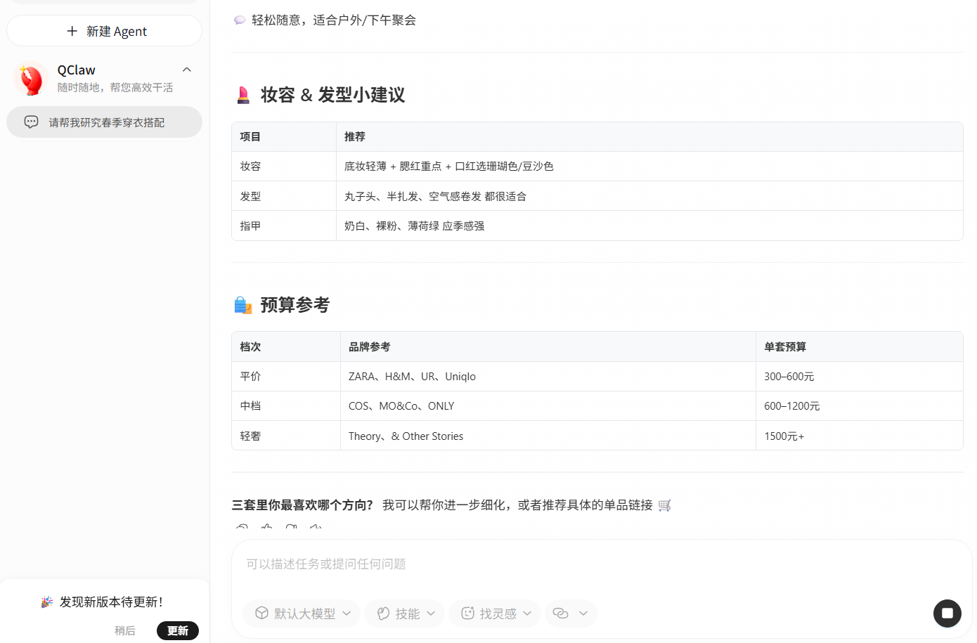 最让我惊喜的是,qclaw不仅给穿搭建议,还会根据场合、天气、预算等多维度因素综合考量。它像一位经验丰富的造型师,却又比真人更耐心、更客观、更了解你的需求。