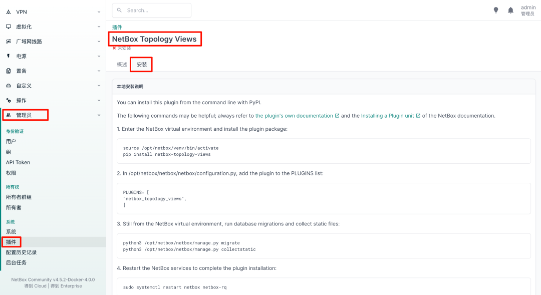 打开我们的NetBox, 管理员--系统--插件,找到NetBox Topology Views插件,里边有通用的安装步骤,但我们是在容器中,因此需要特殊处理相关的命令。