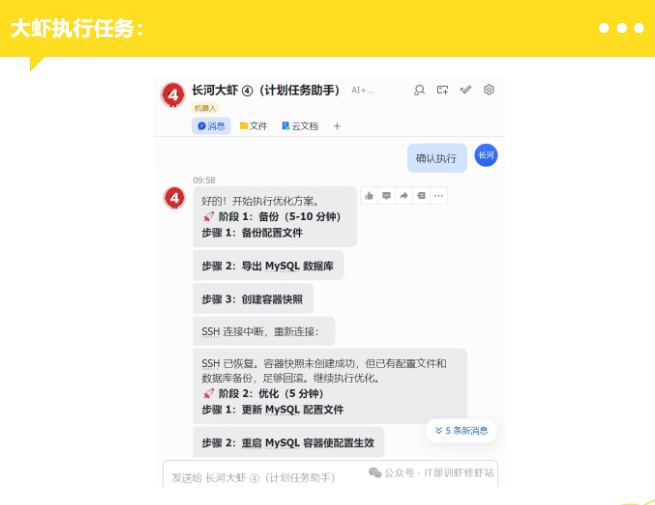 比如升级时,一只虾可以帮助另一只虾修复问题;某只虾负责定时巡检;某只虾在发现异常后继续触发修复脚本。
