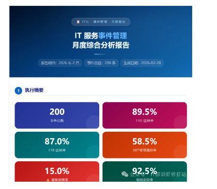 第五天,我把一个月内的 200 条脱敏事件单交给小龙虾,生成 ITIL 事件管理月度分析报告。