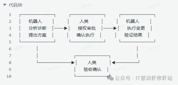 问题分析 → 方案提出 → 风险评估 → 人工授权 → 执行变更 → 结果验证 → 后续追踪