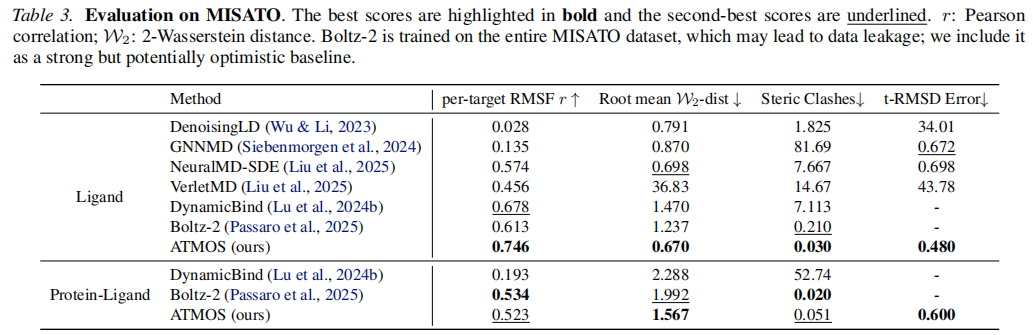 ATMOS 在配体动力学评估中四项全能最优,尤其在空间冲突(Steric Clashes,0.030)和时序精度(t-RMSD Error,0.480)上大幅领先,证明其生成的配体运动既物理合理,又具备时序一致性。