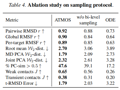 两项消融均验证了各组件的必要性:去除双层采样导致误差累积效应;将 SDE 替换为确定性 ODE 则大幅损失构象多样性,印证了随机性对生物分子热力学采样的本质重要性。