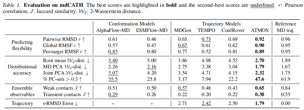 模型 | Pairwise RMSD r ↑ | Global RMSF r ↑ | Root mean W₂-dist ↓ | t-RMSD Error ↓ |