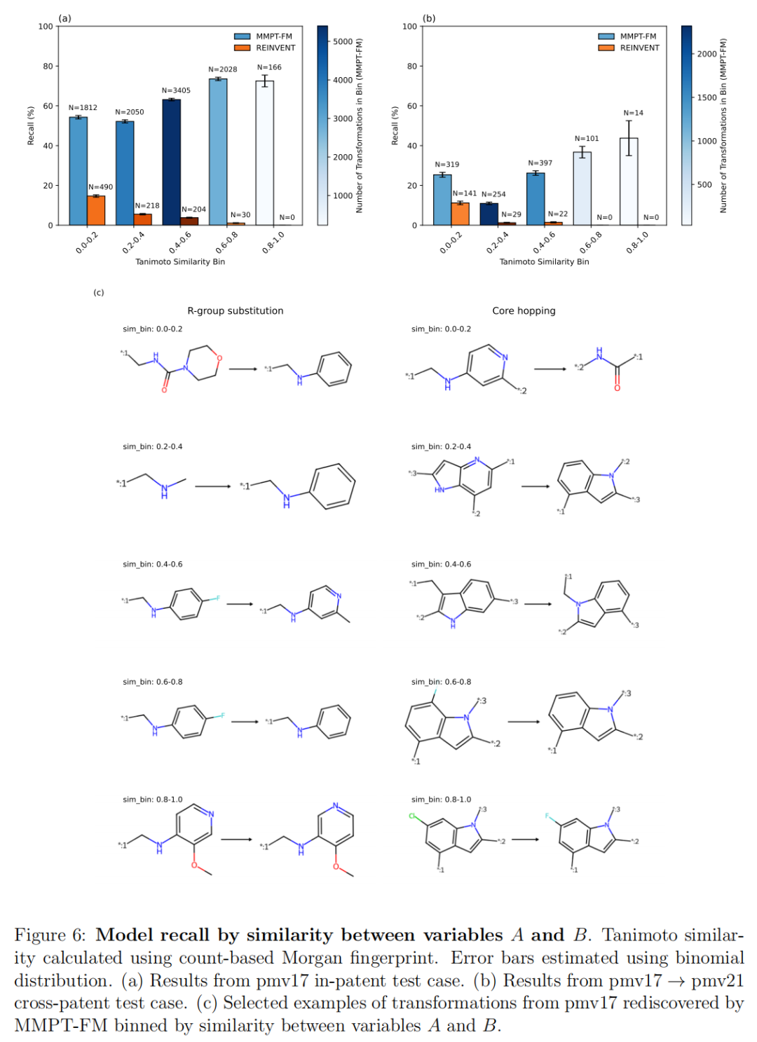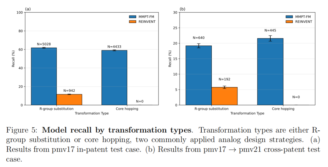 MMPT-FM在核心跃迁(≥2个连接位点的变换)和R基替换上取得了可比的召回率,而REINVENT的LinkINVENT在核心跃迁上完全失效。这表明变换中心学习能够统一处理质量上不同的类似物设计策略,无需针对不同任务类型分别构建专用模块。