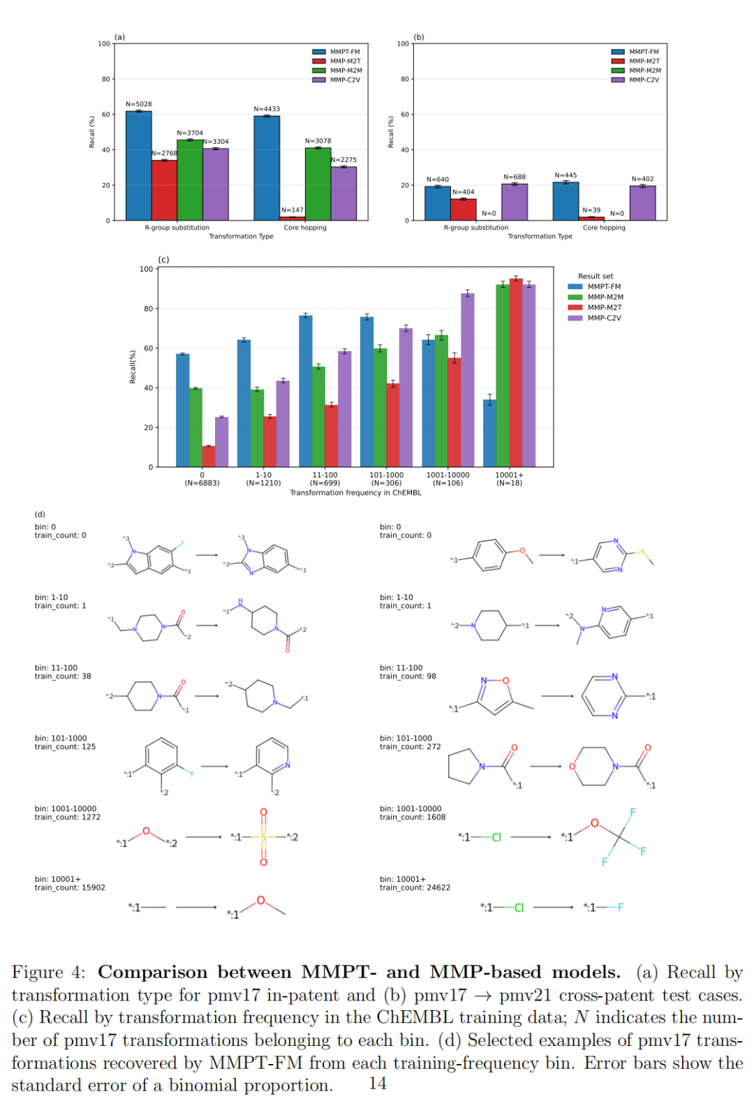 对pmv17专利内分子及pmv17→pmv21分子对,同样使用MMPDB提取MMPTs,形成评估集。重要细节:pmv17 MMPT提取使用与训练数据相同的MMPDB参数,确保变换粒度的一致性,避免评估-训练不对齐。