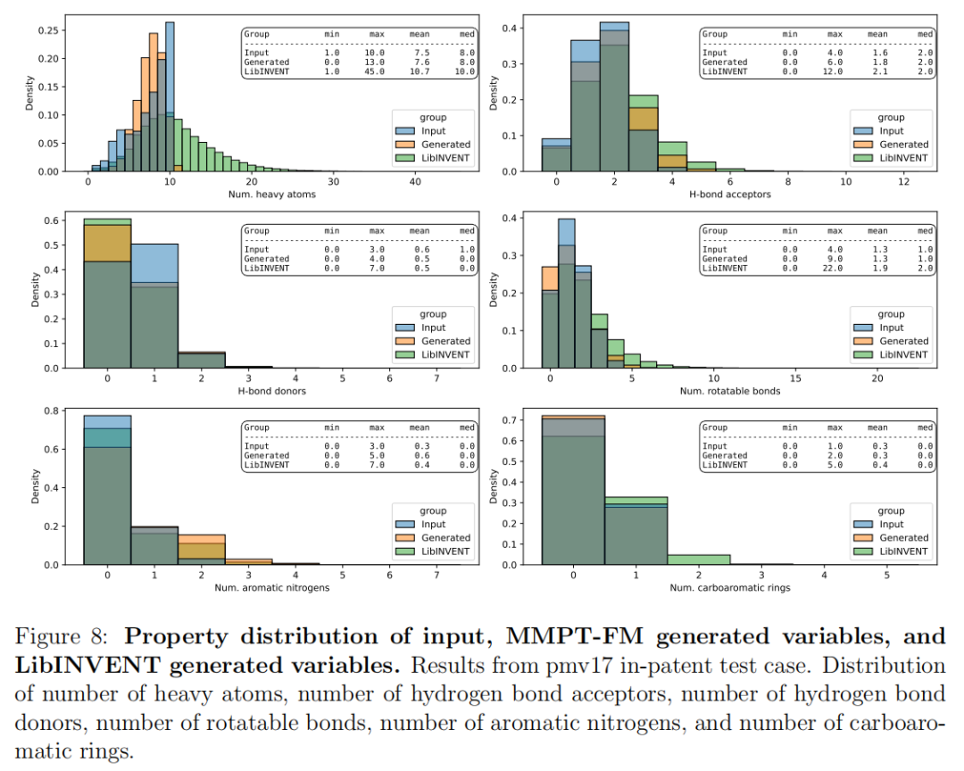 研究比较了输入变量、MMPT-FM生成变量、LibINVENT生成变量在六个关键性质上的分布: