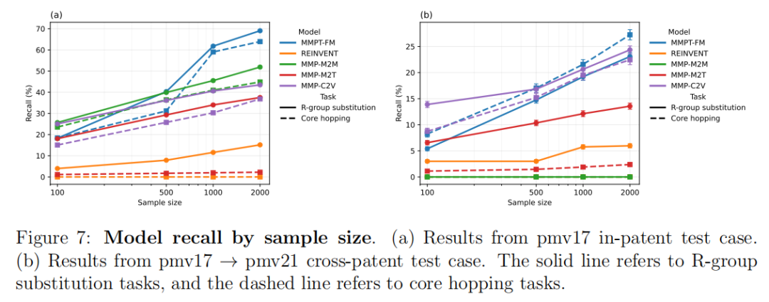 MMPT-FM的斜率优势:在相同的样本数下,MMPT-FM的召回率增长斜率更陡,表明其化学空间探索效率更高——用更少的生成次数覆盖更多的真实变换。这对计算成本敏感的工业应用尤为重要:1000个样本的MMPT-FM往往等效于2000个样本的MMP模型。