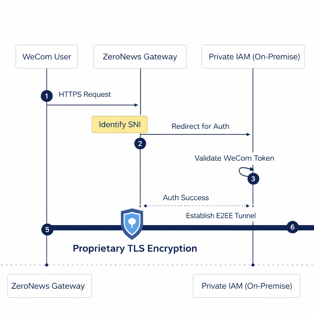 除了隧道本身的加密外,ZeroNews提供了端到端的TLS方案,私钥可以部署在上游应用端,这样便不用担心数据泄密问题。IAM服务部署在企业自己的服务器,企业通讯录也不会外泄。