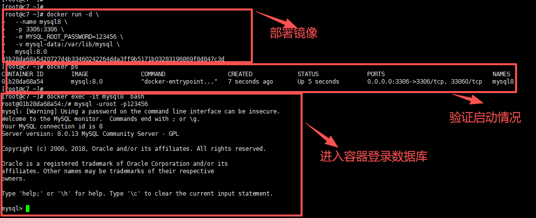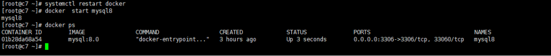 01b28da68a54 mysql:8.0 "docker-entrypoint..." 3 hours ago Up 3 hours 0.0.0.0:3306->3306/tcp, 33060/tcp mysql8