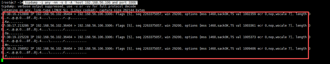 tcpdump -i any -nn -s 0 -A 'host 192.168.56.106 and port 3306'再在其他机器上进行访问(登录数据库或者telnet探测均可)