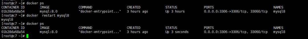 01b28da68a54 mysql:8.0 "docker-entrypoint..." 3 hours ago Up 3 seconds 0.0.0.0:3306->3306/tcp, 33060/tcp mysql8