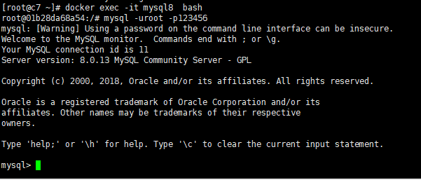 mysql:8.0完成后进入容器,并测试是否可以登录: