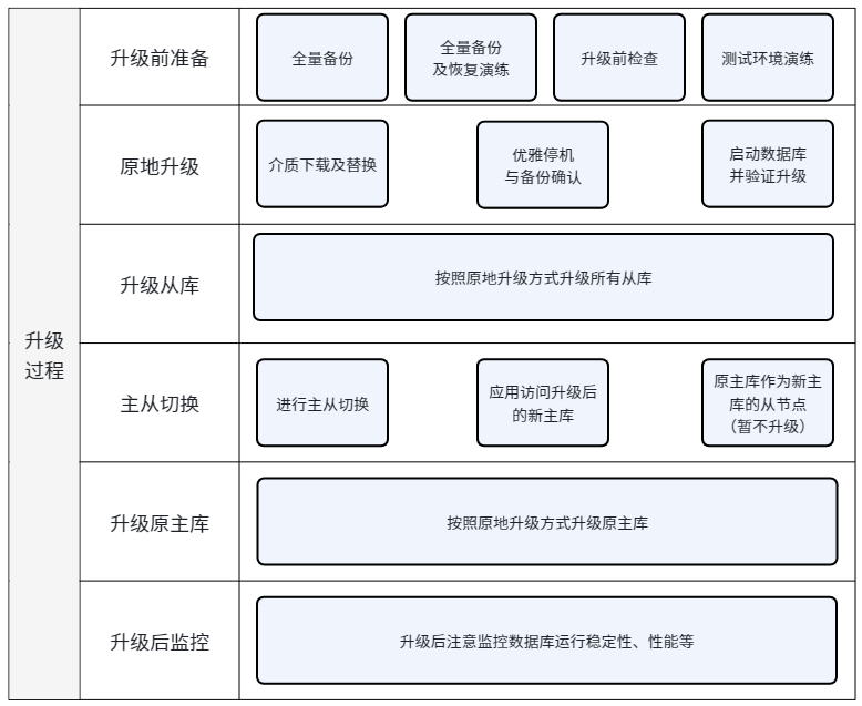 原地升级 | 单实例、小版本升级、停机窗口充足 | 中等(30分钟-2小时) | 低 | ★★★★☆ |