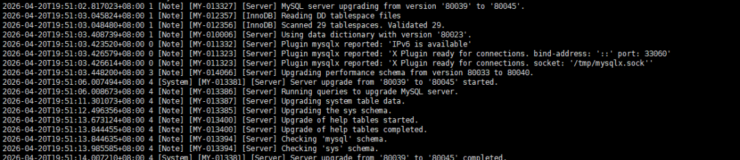 现在(8.0.16及之后):mysql_upgrade工具已被废弃。升级逻辑直接集成到了mysqld进程中。当你用新版本的二进制文件启动数据库时,它会自动检测并升级数据字典和系统表。