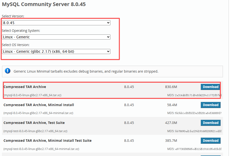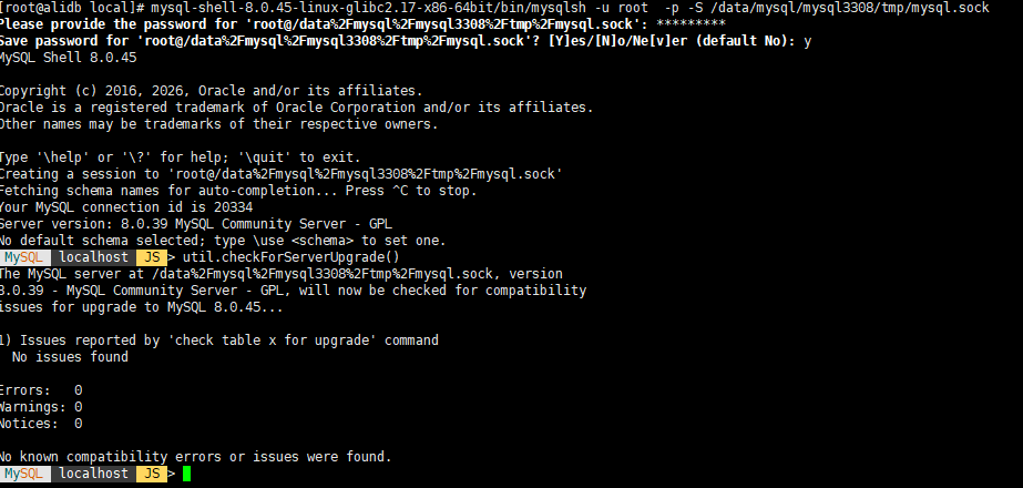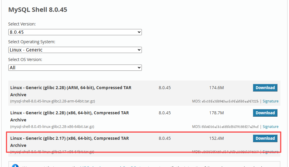 选择对应版本的mysql shell进行升级前兼容性扫描(强烈推荐),当前版本是MySQL8.0.45