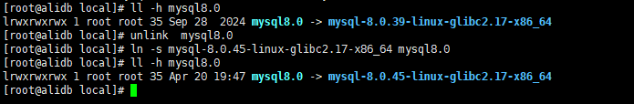 逻辑升级比较简单,本次就不做演示了。生产环境相同大版本基本选择原地升级的方式。本次因为是从MySQL8.0.39升级到MySQL8.0.45,就使用原地升级的方式。主从滚动升级的方案每个节点的升级也优先选择原地升级。