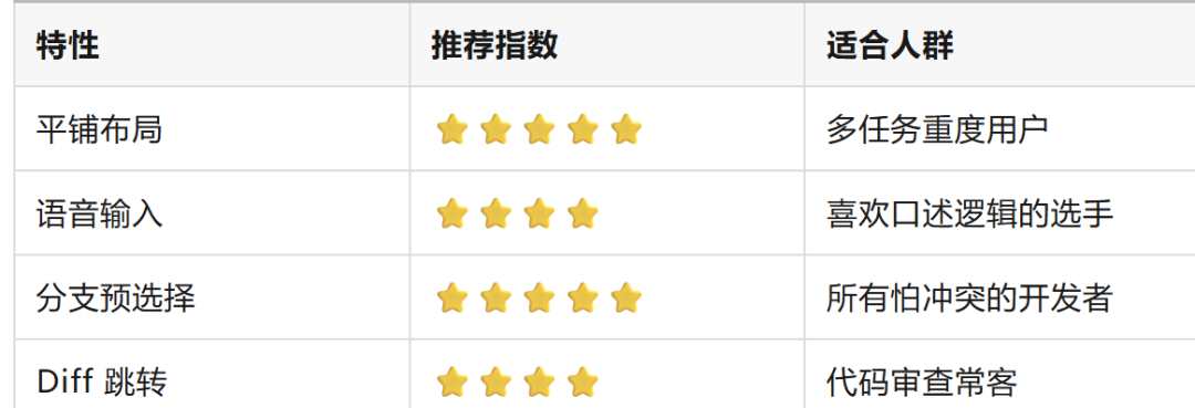 ✅ 平铺布局 → 多任务并行是常态 ✅ 语音优化 → 边想边说比边想边敲快 ✅ 分支预选择 → 谁没在错误分支上写过代码?举手🙋 ✅ Diff 跳转 → 少一次复制粘贴,多一次准时下班