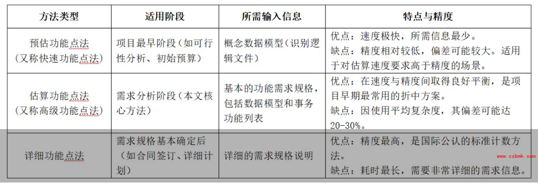 为了确保功能点计数的客观性和可重复性,国际上广泛采用由荷兰软件度量协会(NESMA)定义的功能点分析方法。NESMA方法提供了三种详细程度不同的技术路线,以适应项目不同阶段的需求和可获得的需求细节程度。这三种方法在计数过程、所需输入信息和精度上存在显著差异,其对比分析如下表所示。