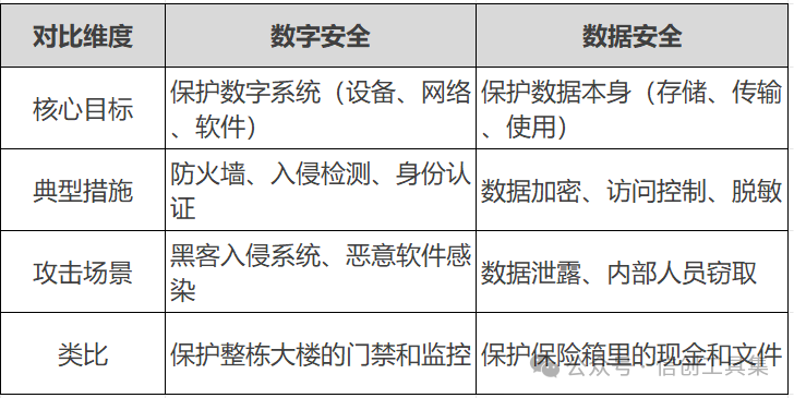数字安全是更广泛的防护体系,而数据安全是其核心组成部分,专注于数据生命周期内的保护。两者需协同工作,才能构建完整的安全防御体系。