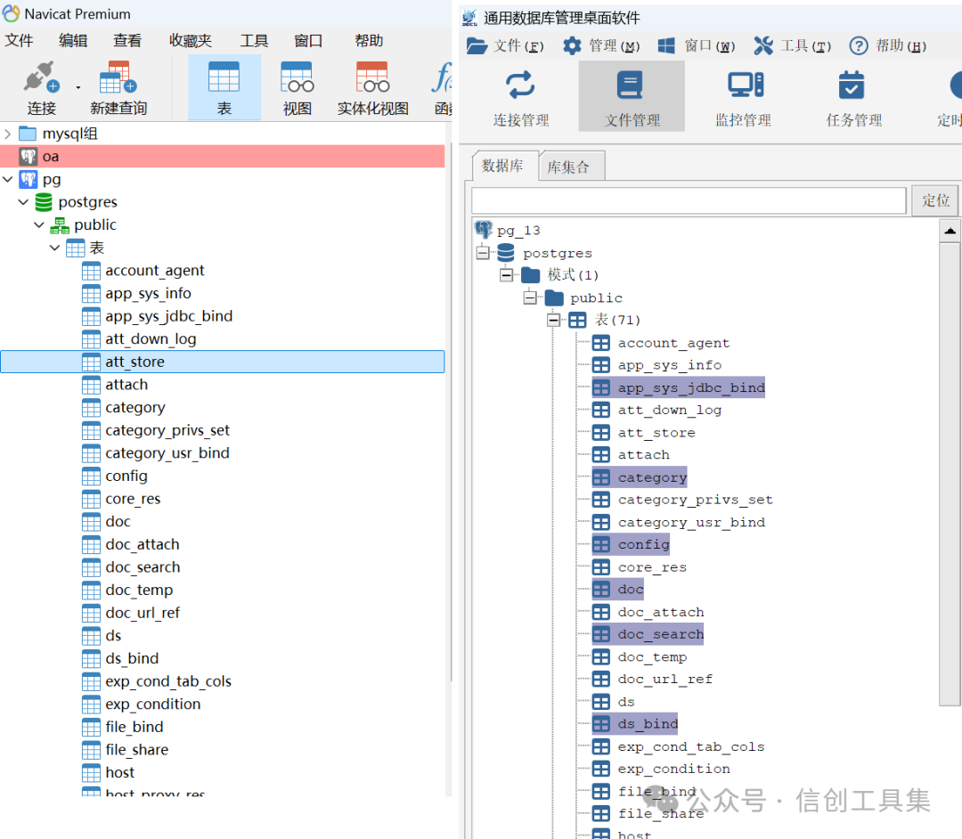 节点多选是DBCS非常好的一个功能。用户通过使用shift和ctrl配合鼠标的点击完成多选工作。看似好像操作非常简单,但实现起来并不如容易,因此Navicat就没有实现这种节点多选功能。如下图所示,Navicat树状结构中只能选择一个对象进行操作,而DBCS支持选择多个对象。