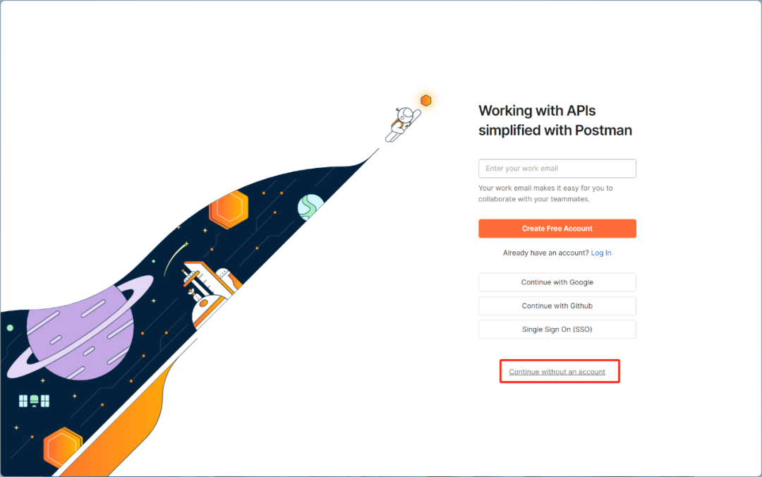 Postman总会建议你创建一个账号,这个地方很讨厌,总要先点击无账号,才能进入到测试功能界面。