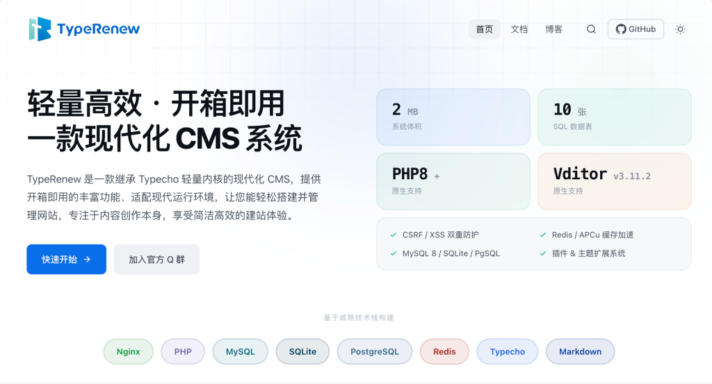 如果你渴望拥有极致轻量化的底层,又想要现代商业级 UI 的丝滑体验,今天阿喵要为你推荐一款“集大成者”——TypeRenew。它完美继承了 Typecho 的轻量内核,并在此基础上进行了深度的现代化重构与升级,主打一个“轻量高效・开箱即用”。无论是写个人博客、搭建创作者主页还是做轻量级资讯站,它都能给你带来耳目一新的建站与创作体验。