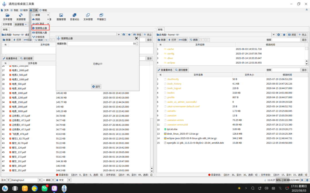 使用过程非常简单,点击工具菜单下的“锁屏阻止器”。弹出的对话框中,能够设置唤醒时间,其原理是通过系统后台轻微晃动鼠标进行屏幕解锁。