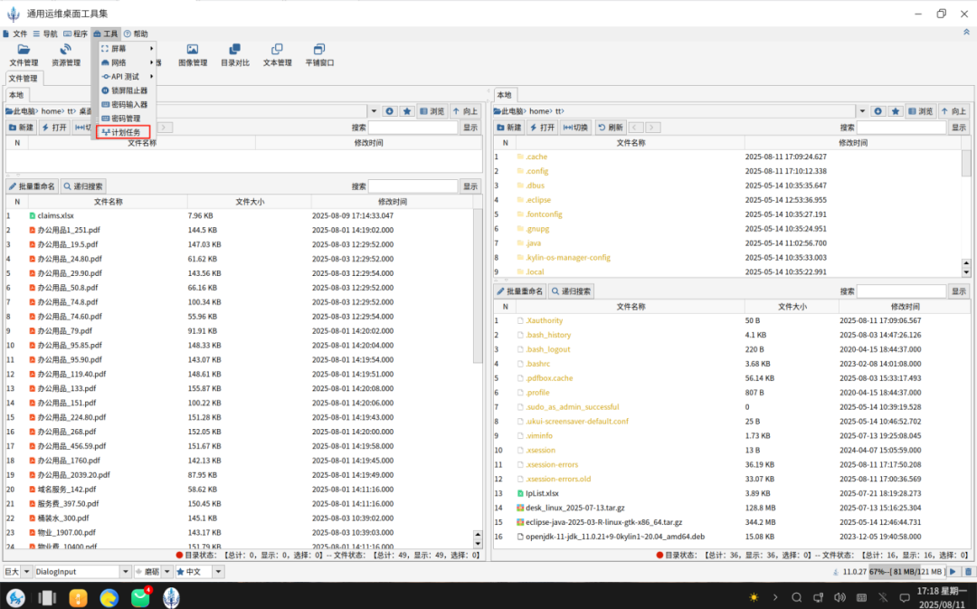 无论信创操作系统还是Windows其实都已经支持了定时任务,但为啥用的人很少呢?其实这句话是不准确的,不是用的人少,而是“会用”的人少。其核心原因是使用有点复杂,让普通办公人员难以掌握。其实需要定时的场景还是不少的,比如:马上要下班了,但是有个大文件一直在下载,还要一个小时才能下载完。关机意味着第二天要重新下载,不关机怕被人看到说你不珍惜公司用电,这时候最好的解决方法就是定时任务。