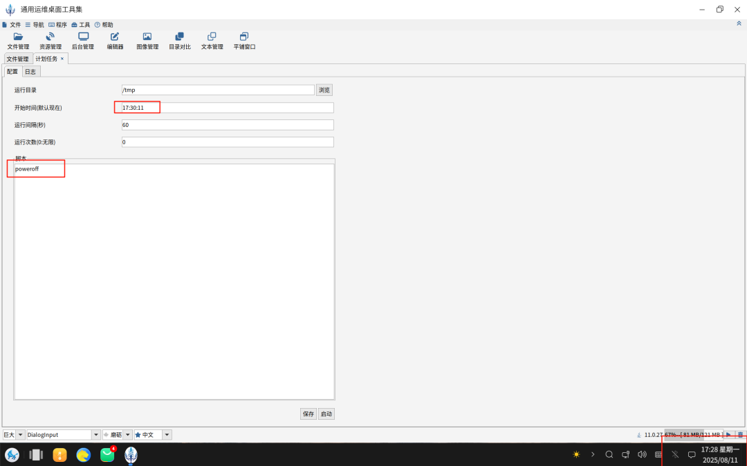 设置启动时间和脚本,对于关机来说linux下的命令为“poweroff”。最后点击启动,然后就收拾回家吧。DESK会在你设定的时间开始调用你输入的命令。