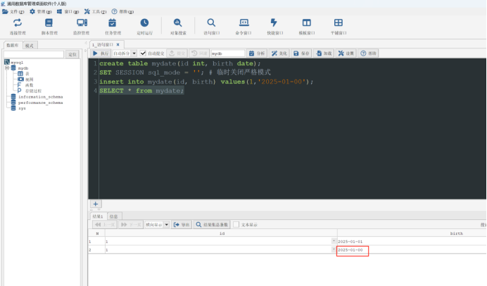 insert into mydate(id, birth) values(1,'2025-01-00');这个标准的sql使用DBCS不能运行。真正的原因是日期不合法,但这里真要吐槽Mysql,这种不合法的日期,在Mysql数据库中竟然允许存在!!!