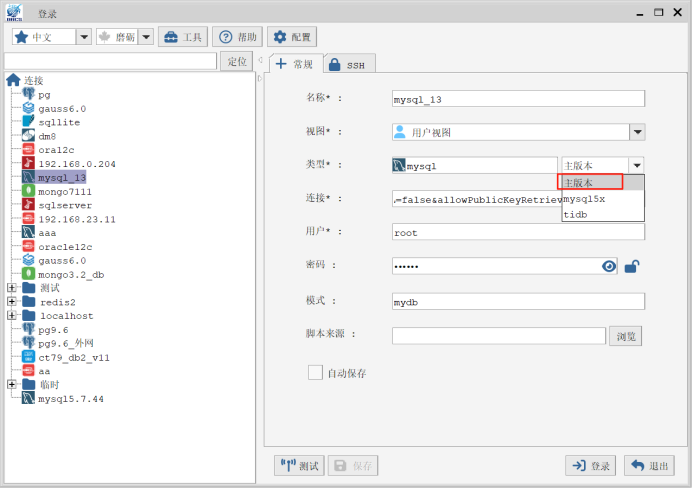 在登录界面中,Mysql 5.x和8.x可以通过下拉框选择版本。尽量不要混用。