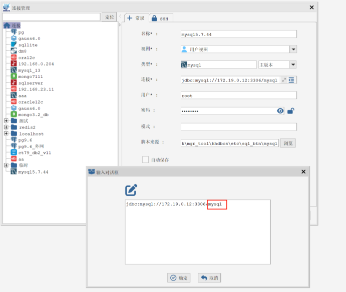 对话框中url的中默认会有个mysql字段,如下图所示。这个mysql字段并不是固定的,他的真实含义是:“登录mysql数据库中默认的模式。”