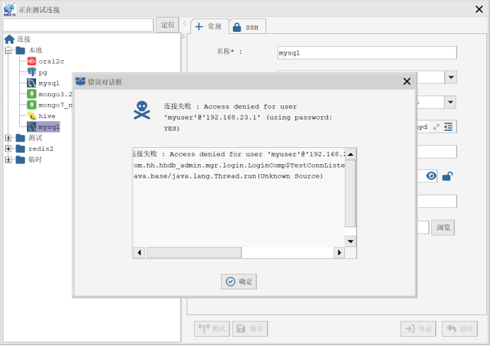 对于这种错误说来,要找数据库管理员,帮你开通权限。权限主要包括你的访问地址和是否有对某个库的访问权限。内容比较多,不行就问AI吧。