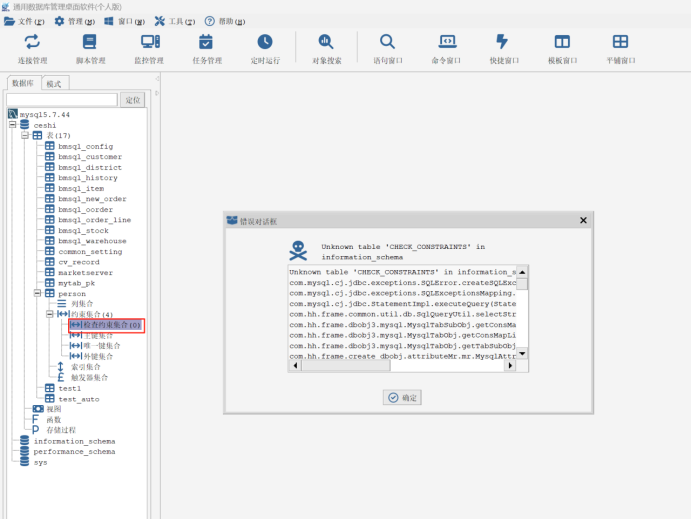 混用会造成部分误解和异常,举例来说:数据库Mysql5.7,但是用了主版本,这时候查询约束的时候就会出错。因为Mysql5.7中是没有检查约束的系统视图的,所以就会出现如下错误: