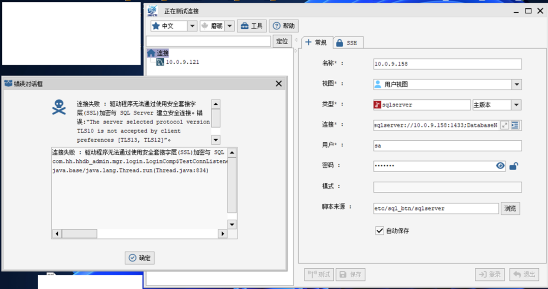 错误原因是老版本使用TLSv1这种加密协议,这种加密协议过于陈旧,DBCS使用的jdk认为不安全,所以默认状态禁止使用。