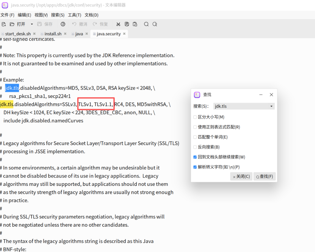 如果jdk.tls.disabledAlgorithms存在TLSv1,就把这些选项删除。如果不存在TLSv1,可以豪放一点,直接把jdk.tls.disabledAlgorithms注解掉。