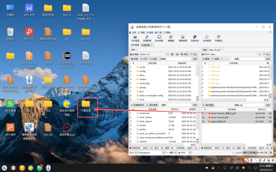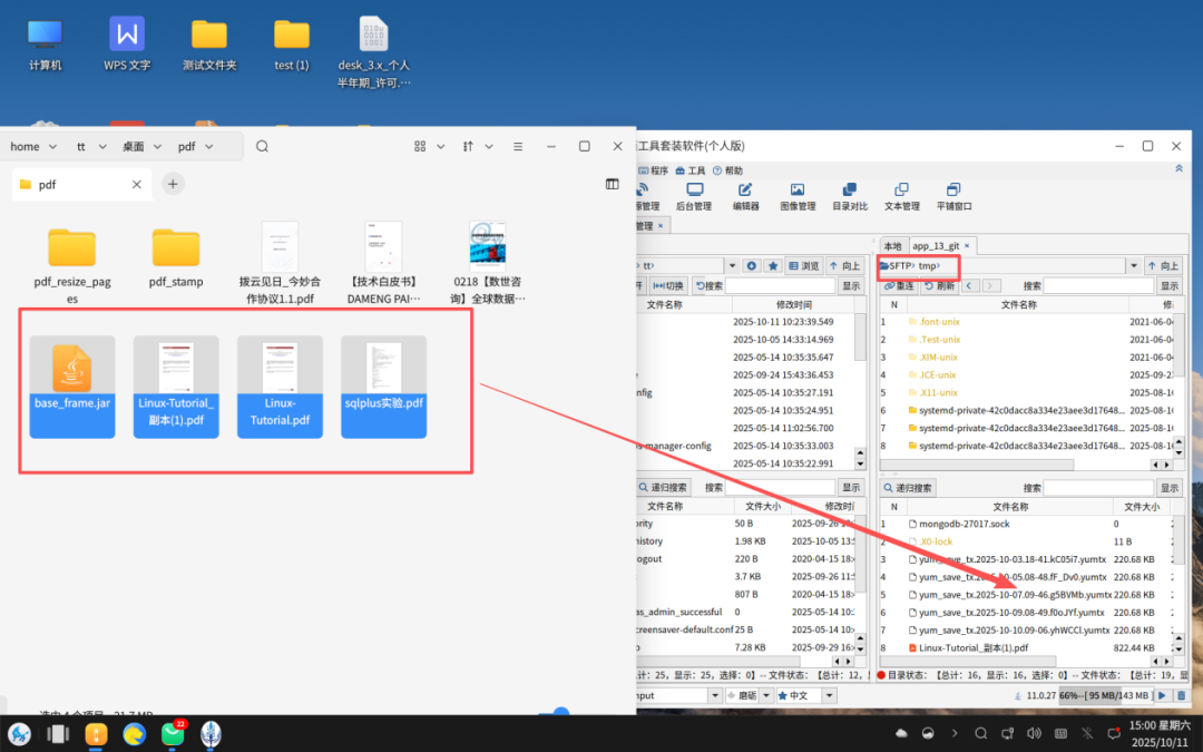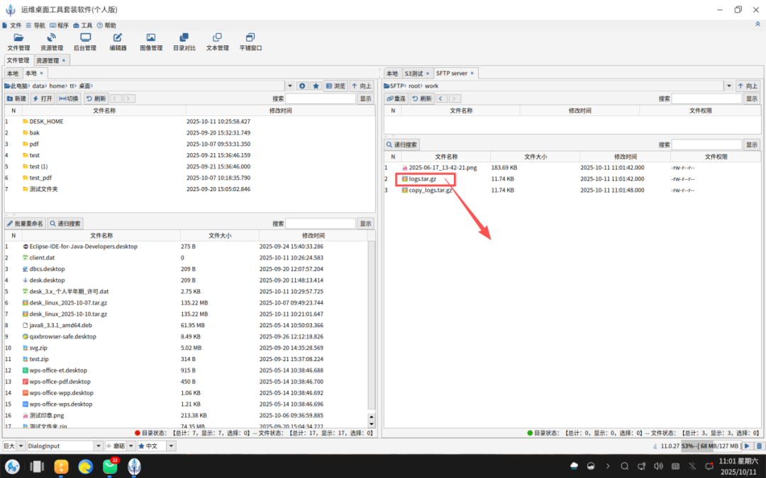 从远程服务器拖拽文件到本地文件管理器如下图: