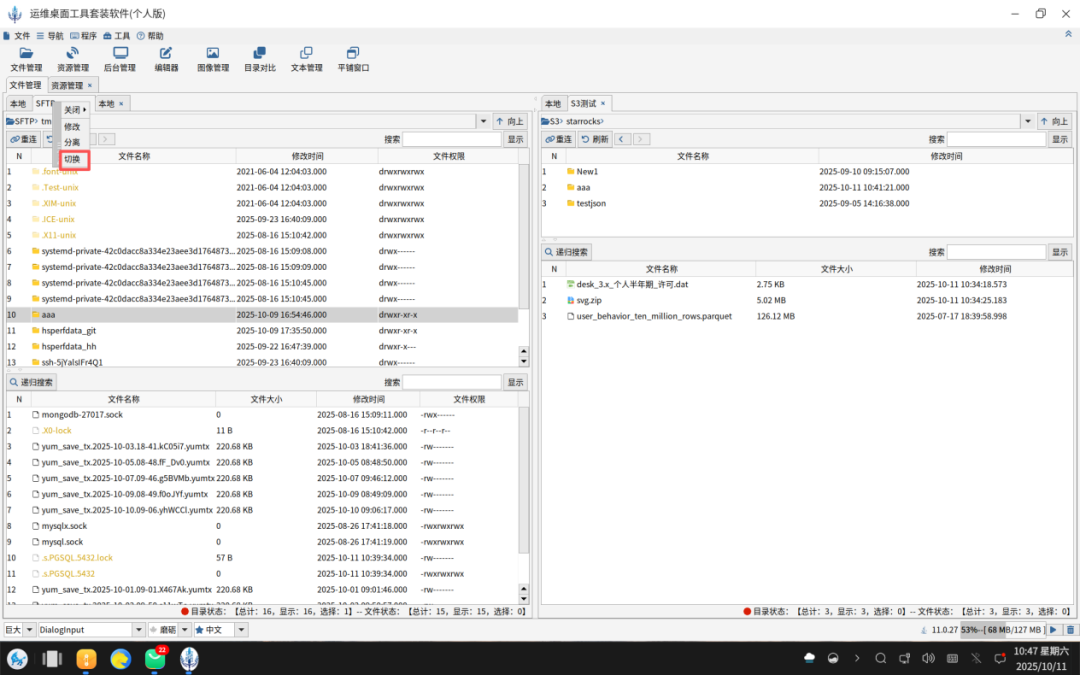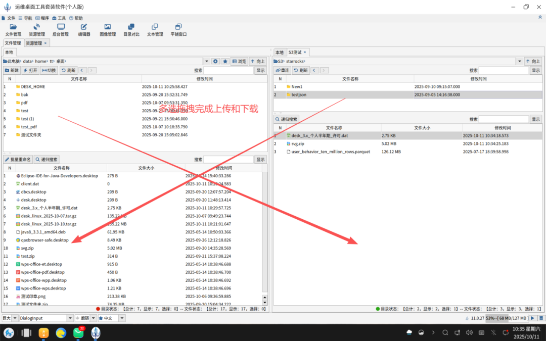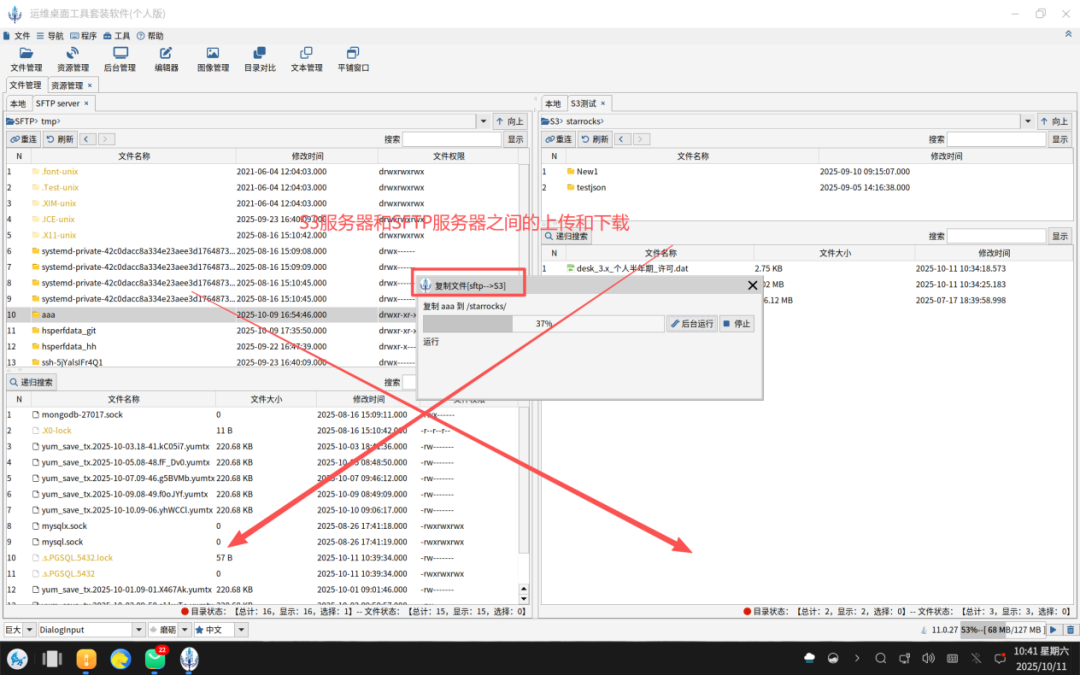 如下图所示,用户可以通过拖拽完成本地到S3协议云端服务的上传和下载。同理可以完成本地和FTP/SFTP/SMB服务器的上传和下载。