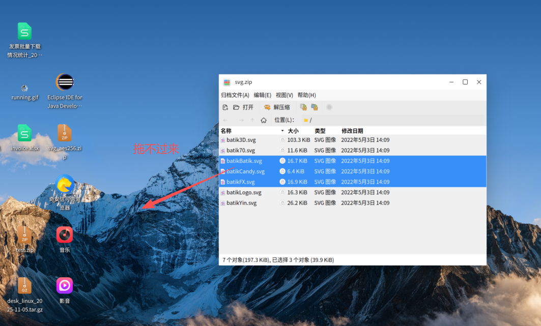 2.这个软件有个非常讨厌的bug, 不能把压缩包中的文件直接用鼠标拖拽到操作系统桌面上。