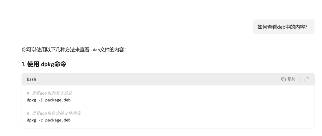 deb文件的重要性,咱们就不说了。反正要求DESK和DBCS发布deb版本的网友络绎不绝,顶不住广大网友的压力。终于在今年发布了两个产品所有架构的deb安装包,详情请参考倚天屠龙记之deb大放送。既然deb文件如此重要,用户想看看里面包含什么内容,怎么办呢?AI最推荐的方法如下: