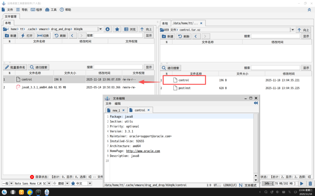 想看看deb文件信息,把control文件复制过来,再用文本编辑器打开,神秘面纱一下揭开。