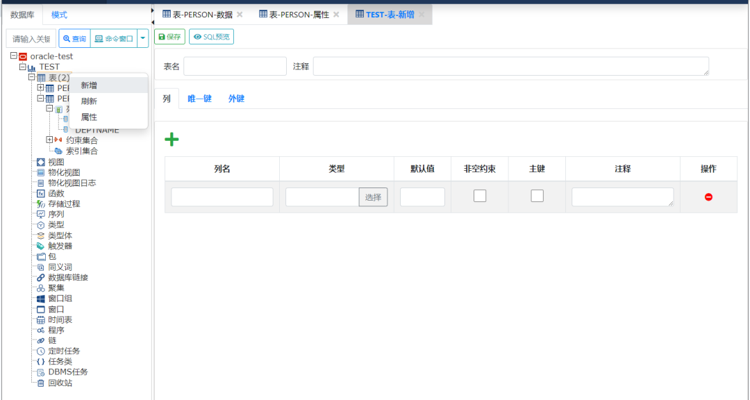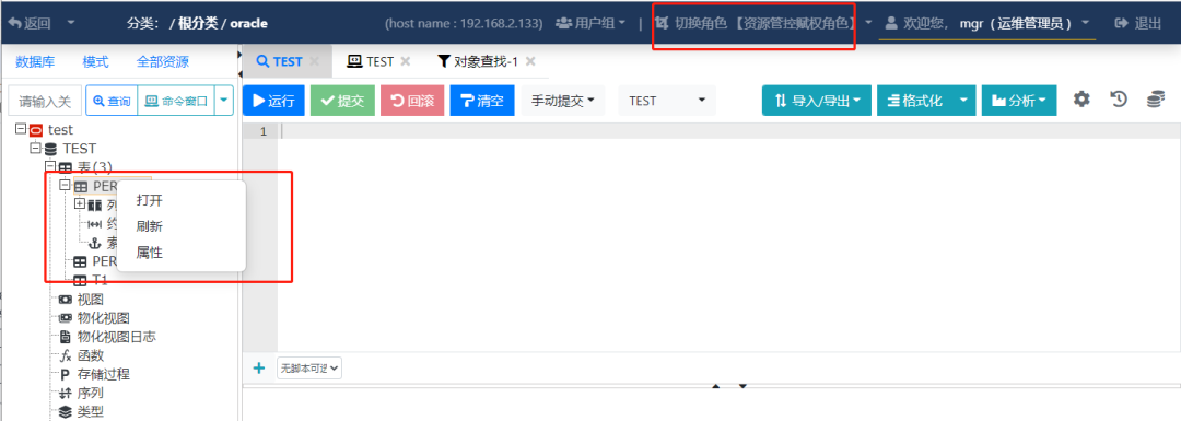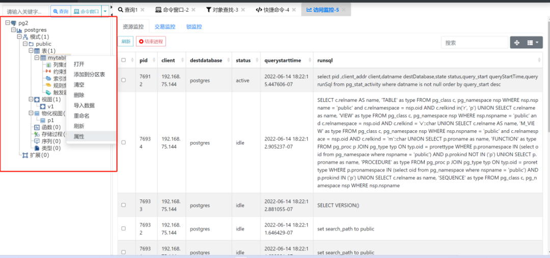 登录XGuard后在【数据窗口】界面中,可以看到左侧是数据库对象树形结构展示,在对象树中选择对象鼠标右击可以查看表、视图、函数等数据对象定义信息等操作。