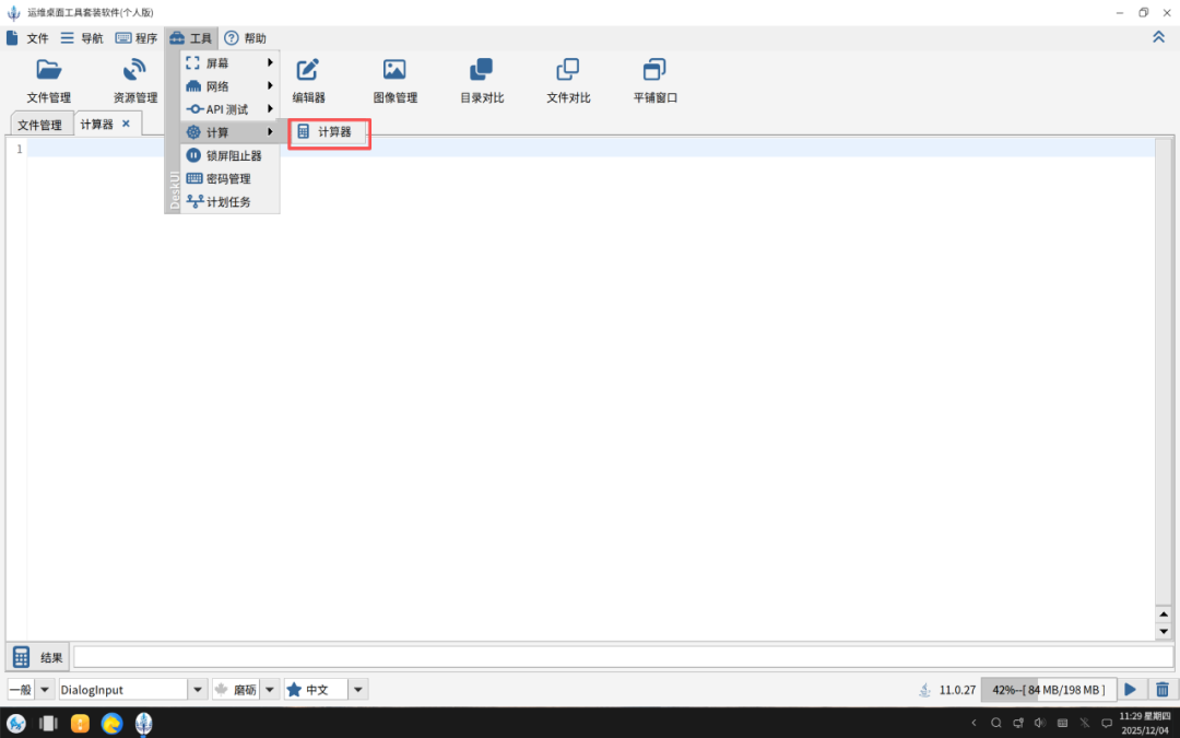 这是时候界面朴素的表达式计算器登场了。先去https://www.deskui.com下载个最新版本,然后使用“工具”菜单中的“计算器”,如下图所示:
