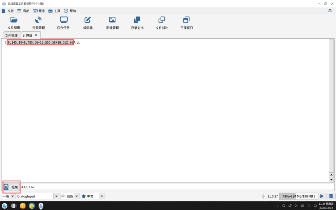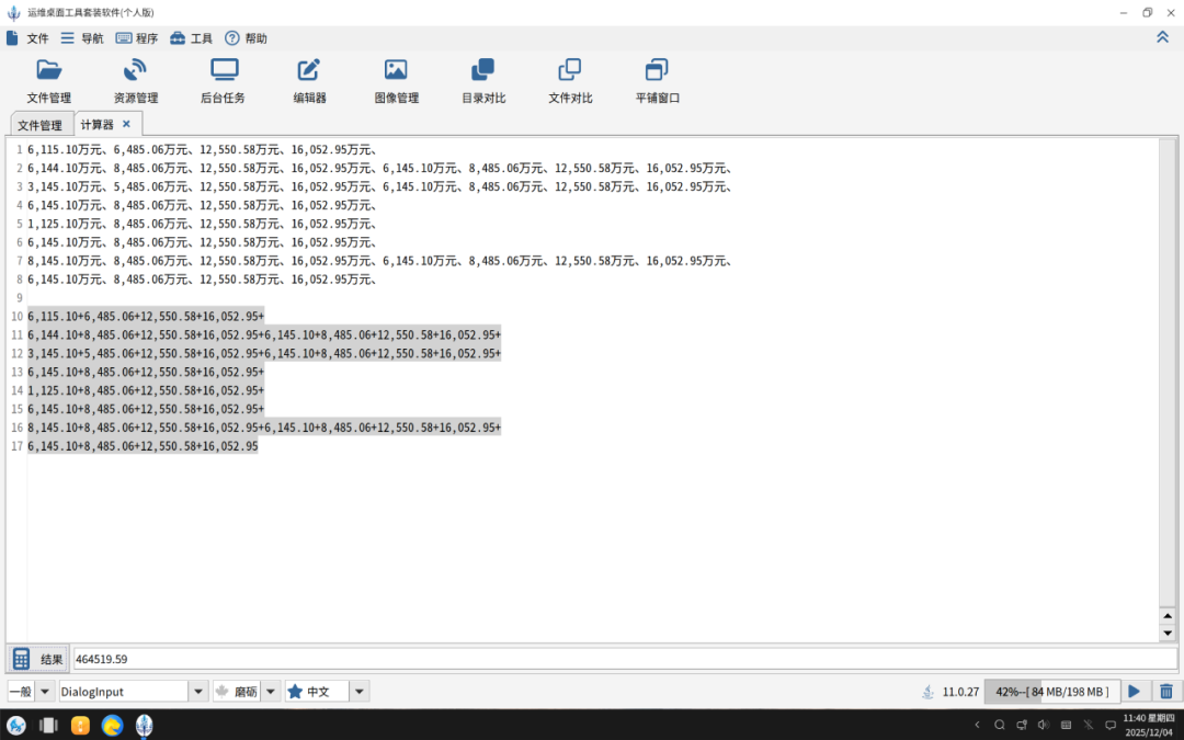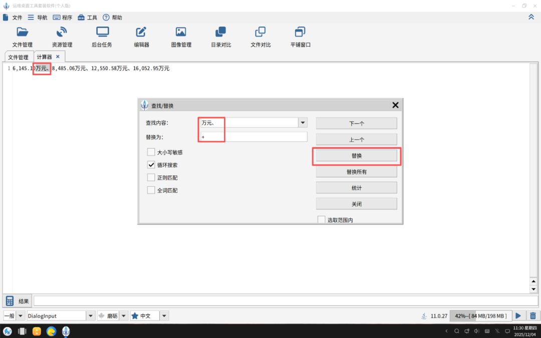 把要计算的部分数字全部通过ctrl+c和v粘贴到计算编辑器面板中,然后ctrl+f弹出搜索替换对话框,在对话框中把“万元、”替换成”+”。