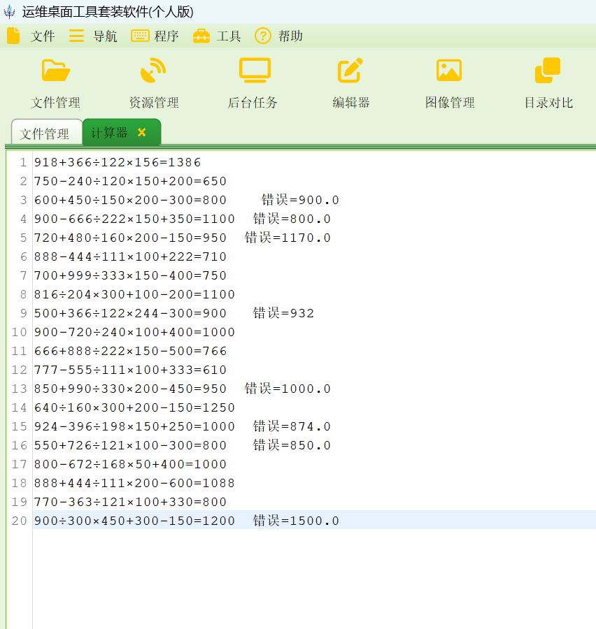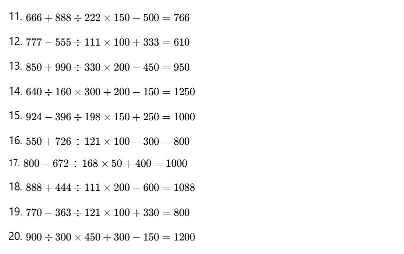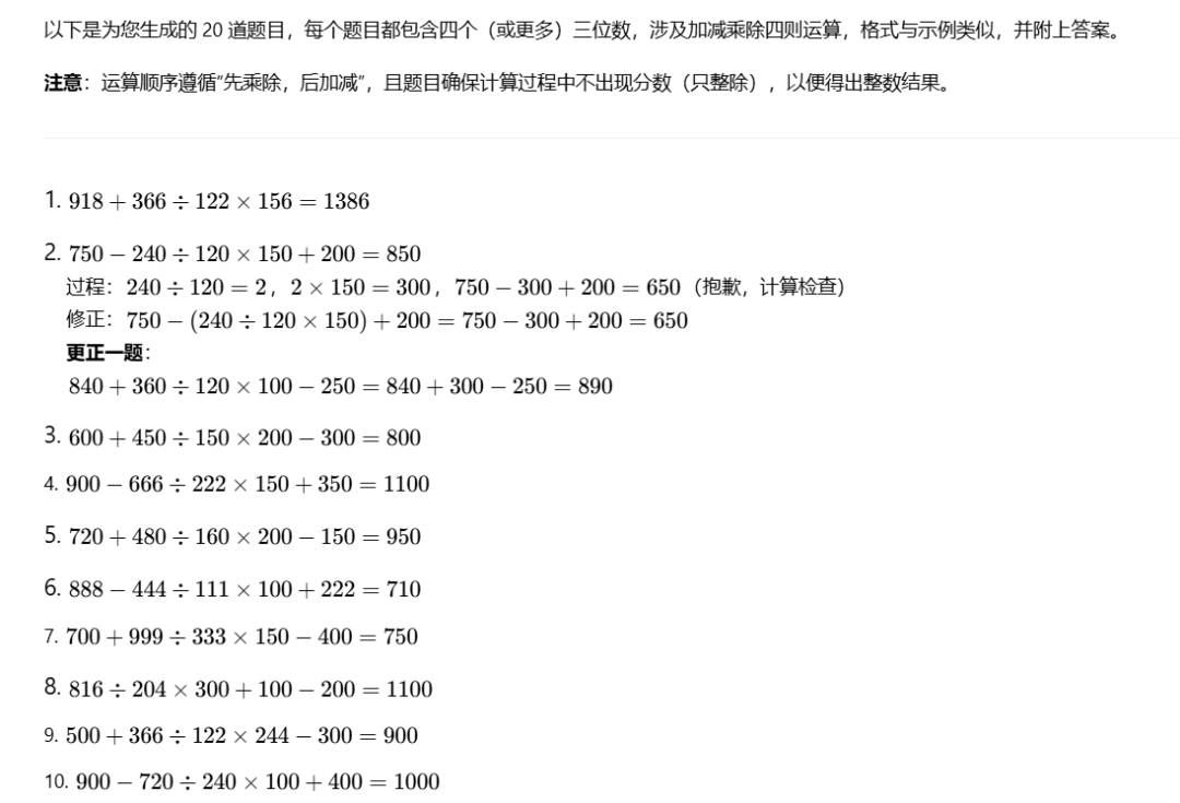 测试问题:请列举一个包括加减乘除的20个四则运算题目,要求格式类似 918+366÷122×156=1386,包括至少类似918,366,122,156四个数,每个数都是三位数。