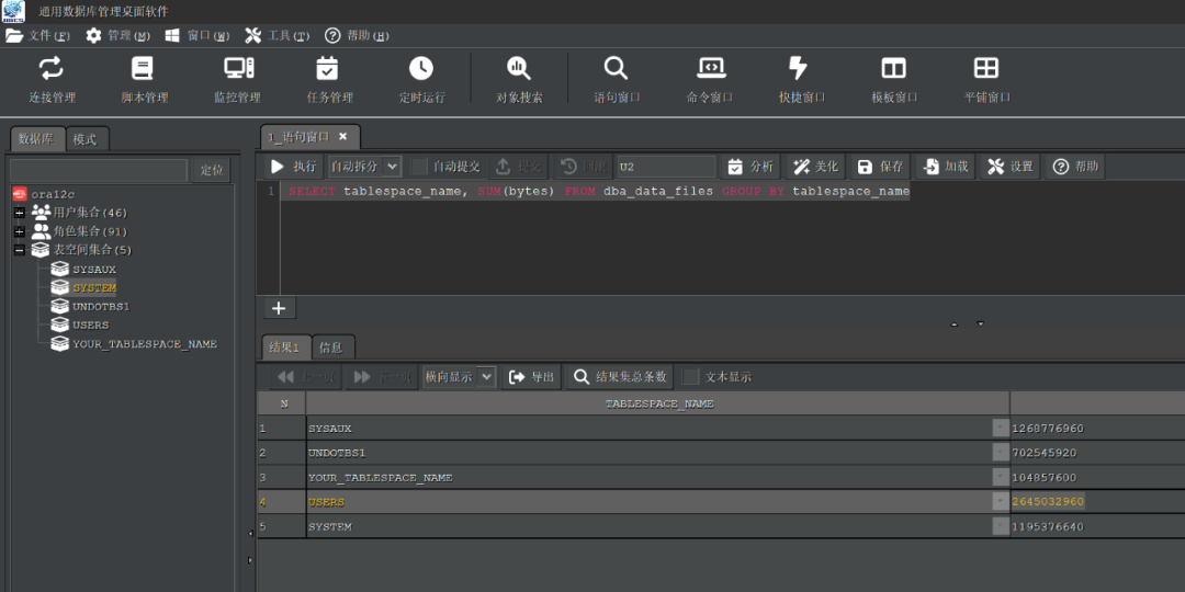 系统告诉我,USERS表空间为2645032960个字节。看到这个数字,大家是不是很难受?但这种场景作为程序员经常遇到。