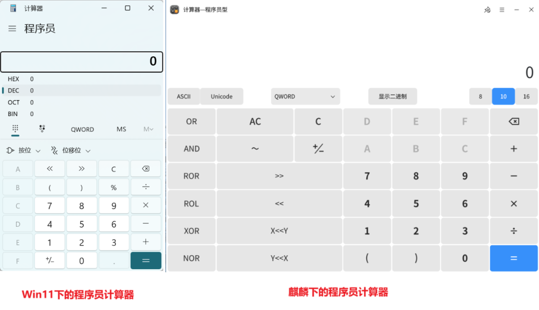 无论是左边的win11或是右边的麒麟操作系统,下面的程序员计算器都非常强调进制转换和逻辑关系,但是作为从业多年的老程序员,我可以负责的告诉大家这两种转换用的不多。进制转换尽管用的不多,但还有点用,对于逻辑转换,基本上不需要通过计算器完成。