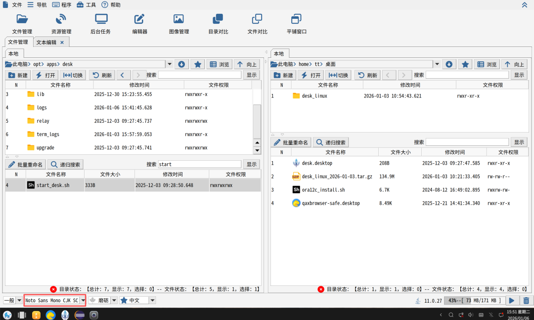 面板上的字符全没了,部分表格中的字符还在,神奇得很。这种问题应该是显卡加速和桌面组件的兼容性问题,如果从显卡角度入手那可难了,所以还是从DESK软件本身进行配置更简单。还是修改start_desk.sh,把启动命令修改为如下: