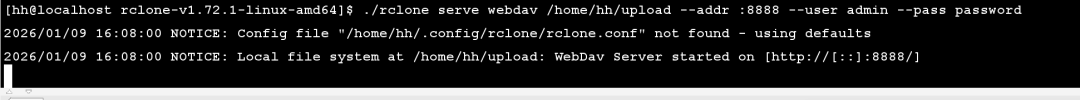 ./rclone serve webdav /home/hh/upload --addr :8888 --user admin --pass password